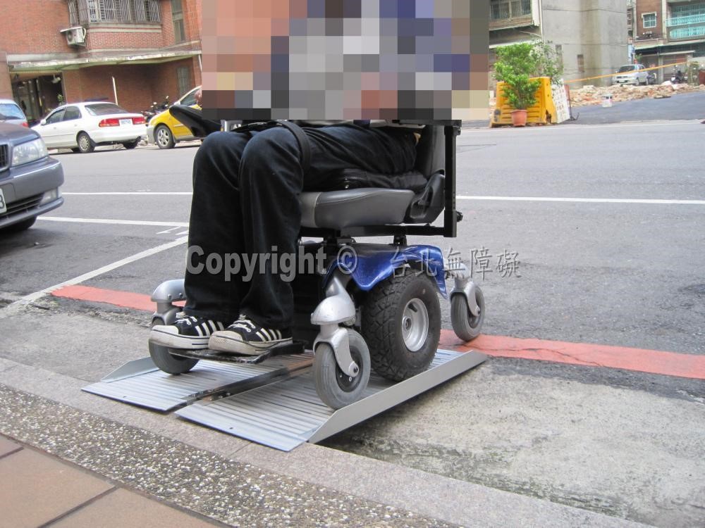 備註:如放置的斜坡板坡度較陡時,需有人協助輪椅上坡。 下坡時輪椅也須有人協助以倒退的方式後退較安全。 |
