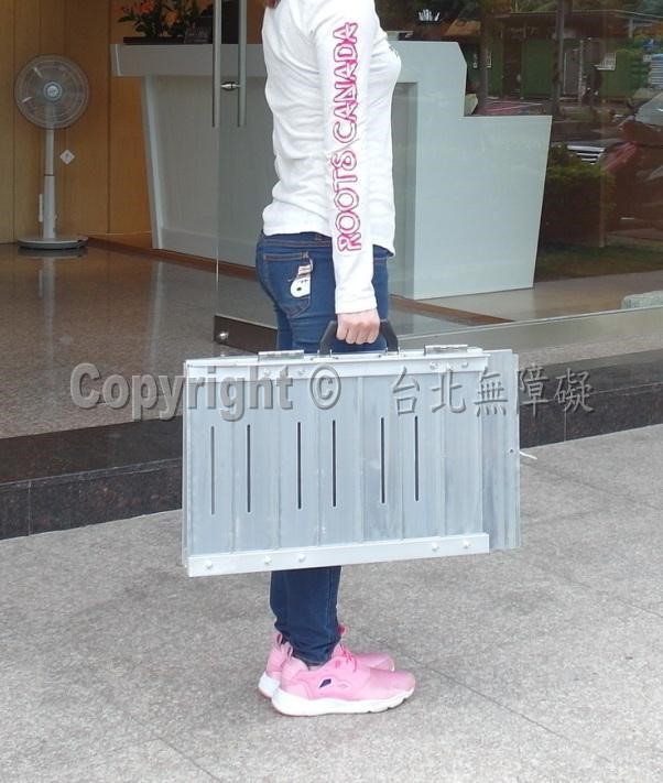 左右折疊式斜坡板,鋁合金材質輕巧便利,防滑設計不怕濕滑,操作省力、容易收放,無需破壞現有建築結構,不佔空間組裝容易,操作簡單一人 即可操作,活動式收納不佔空間,日曬雨淋不變形,特別適用於:輪椅上下階梯,洗澡椅&便盆椅跨越衛浴門檻、店面、商場等地,和高低差大的地方。,是目前最理想平穩解決無法設固定斜坡道的最佳替代方案。